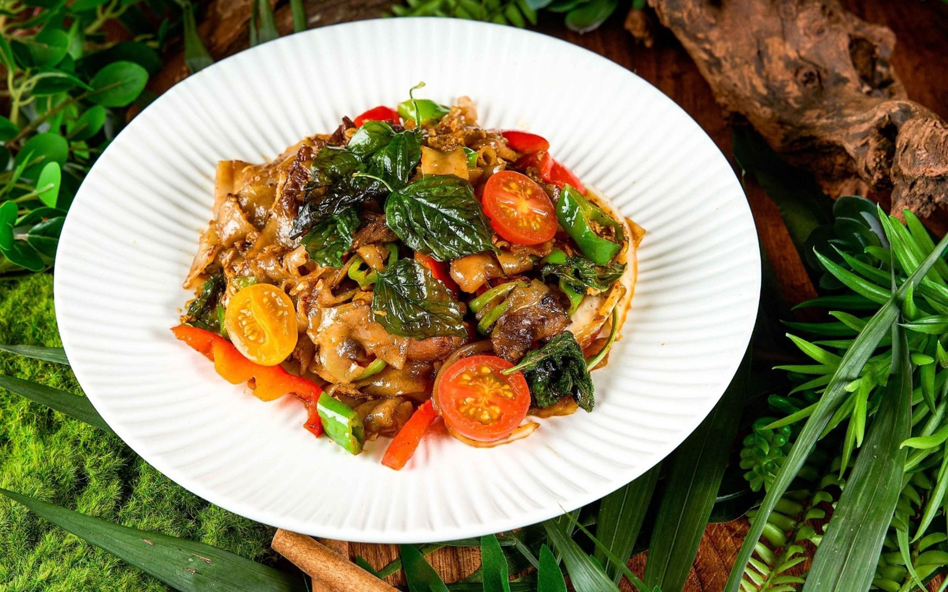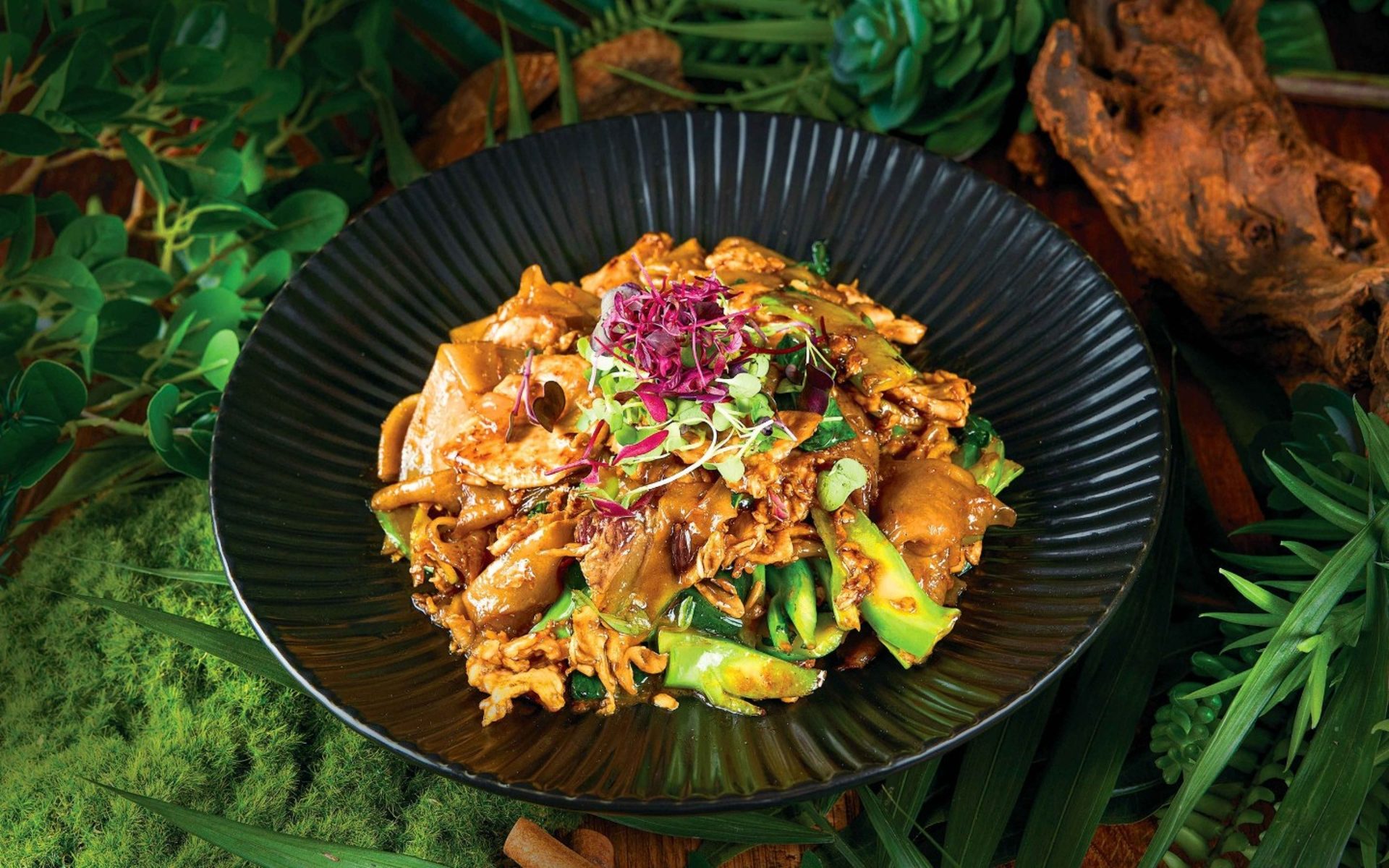 Stir-fried flat rice noodles with seasonal vegetable, and sweet soy sauce.