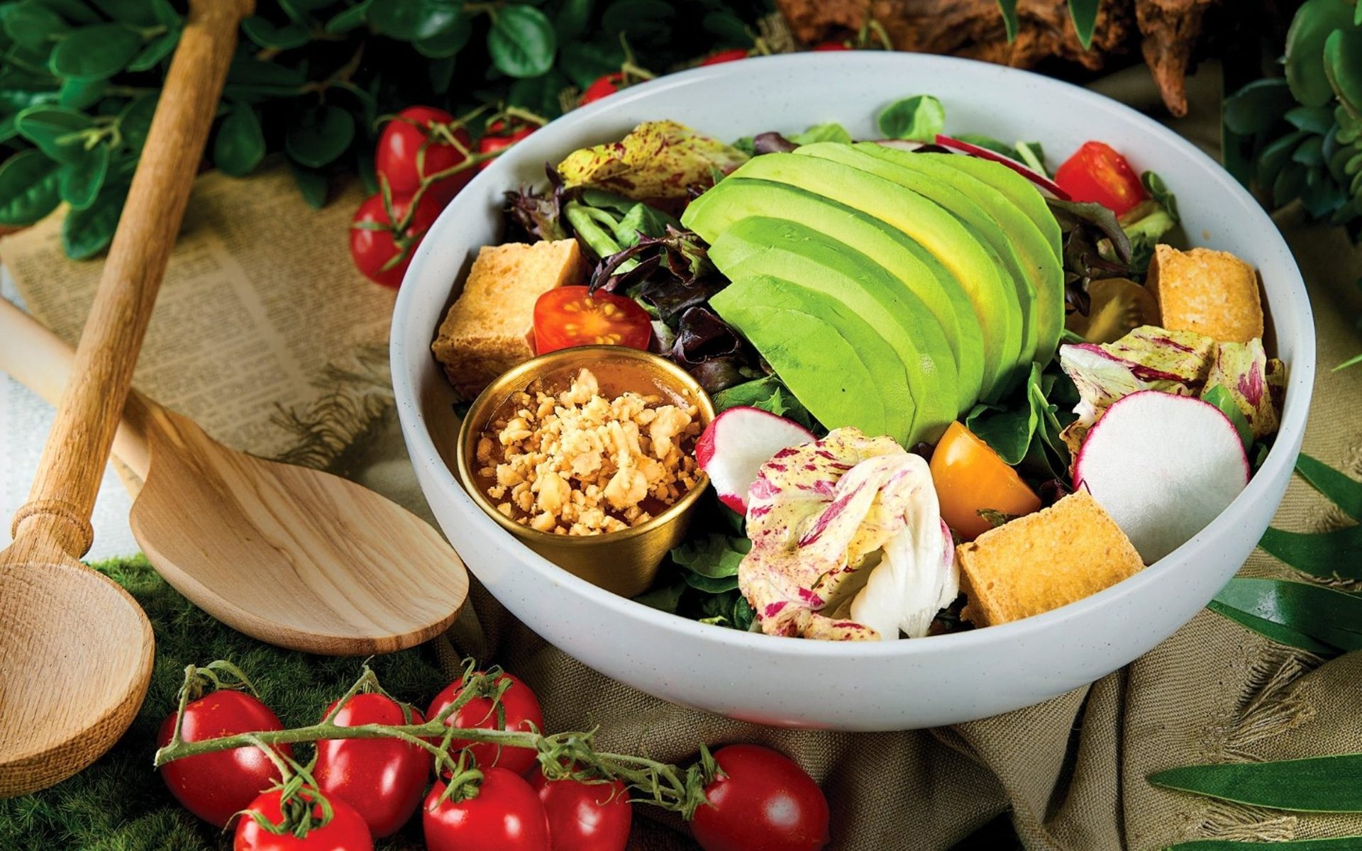 A peanut vinaigrette enhances a refreshing blend of greens, cucumber, and avocado. Fried tofu adds a delightful texture on top.