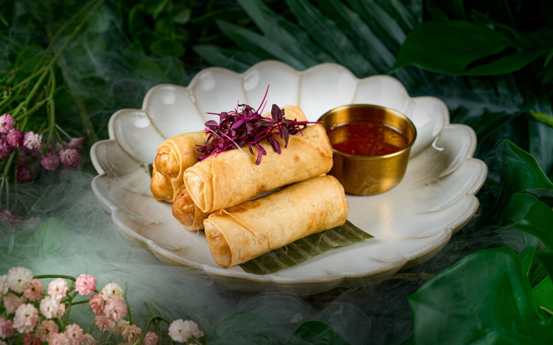Chefs stuff golden-brown vegetarian spring rolls with fresh basil, cabbage, vermicelli noodles, and carrots. Chefs drizzle them with sesame oil for extra flavor.