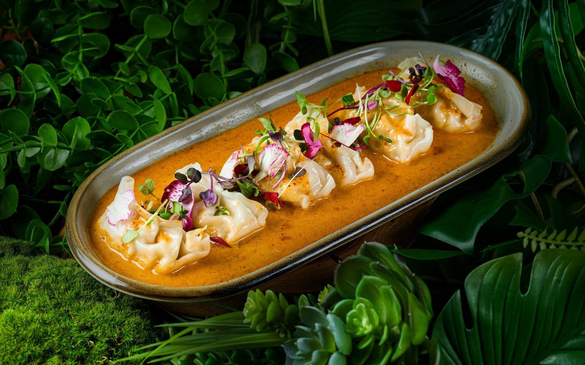 Our restaurant serves steamed vegetable dumplings with a rich, homemade curry sauce. This sauce balances flavors beautifully, creating a delightful appetizer.